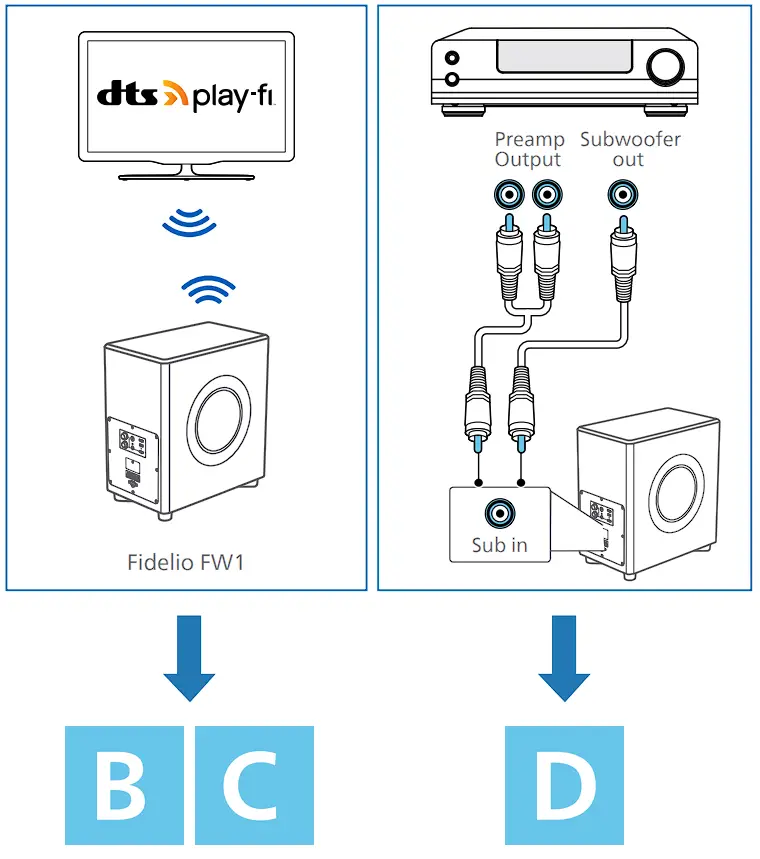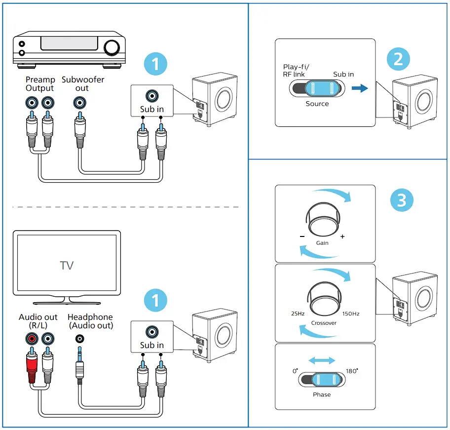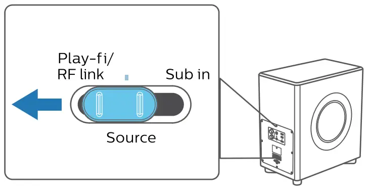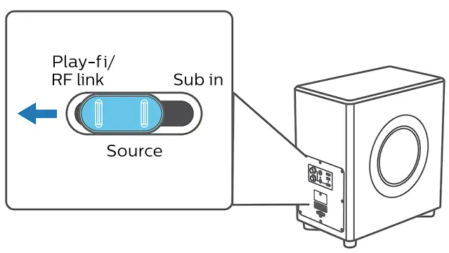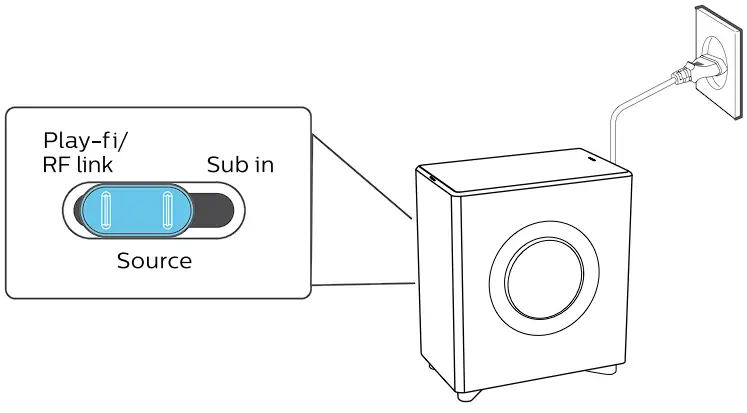 - Connect the subwoofer to power and the source switch at Play-fi/RF Link position.