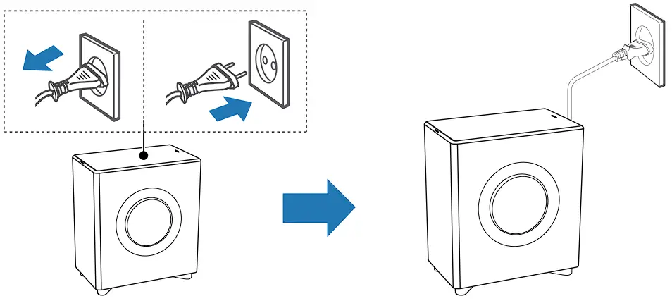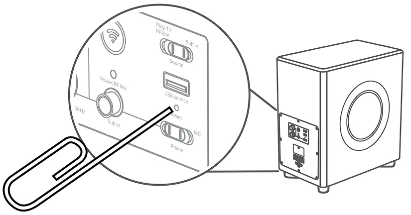 - Connect the subwoofer to power, use a needle to push the Reset button on rear of subwoofer for 5 seconds.
