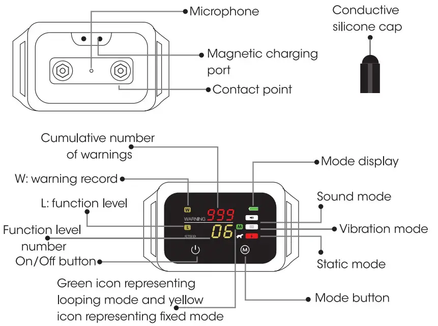 - There are 6 function levels in total. In looping or fixed mode, the corresponding function level number and icons flash when the device is triggered. For example, in the case of static stimulation STEP6, the function level number “6”, as well as the corresponding warning sound, vibration, and static stimulation icons flash. for a period of time that is the same as the operating time.