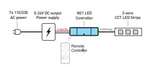 N21 LED controller is designed to drive 2-wire tunable white (CCT) constant voltage LED products in voltage range of DC5-24V. With the RF remote controller, user can setup