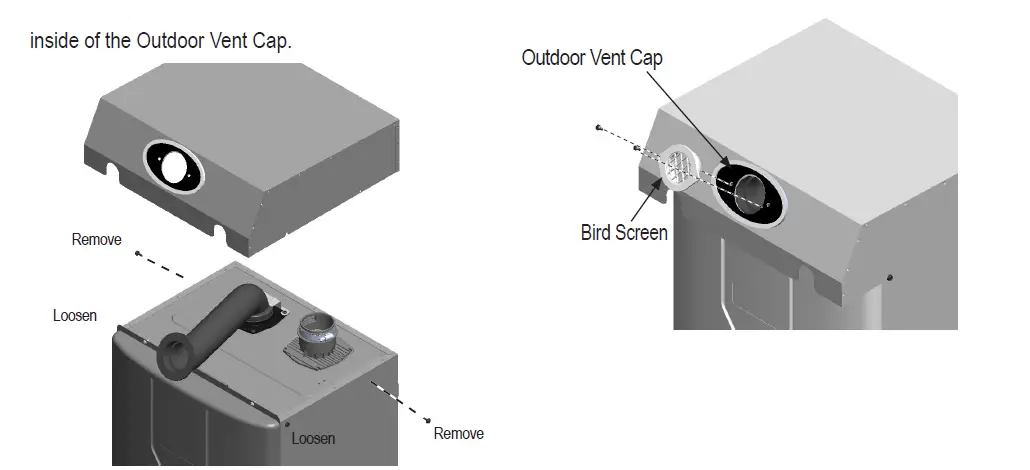 - Use a Phillips screwdriver to loosen the front 2 hex head screws and remove back 2 hex head screws on side of the unit. Place the Outdoor Vent Cap on the unit. Make sure the gasket is applied inside of the Outdoor Vent Cap.