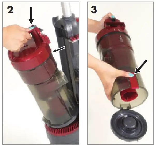 - Hold the Dirt Container over a dust bin and press the Dirt Container Release Button to release the bottom lid