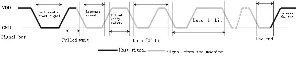 Hosts (MCU) after sending a start signal, DHT11 transition from a low-power mode to high-speed mode, the host until after the end of the start signal, DHT11 send a response signal, send 40bit data acquisition and trigger a letter. Signal transmission shown in fig.
