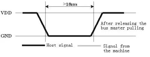 Microprocessor I / O output while the output is set to low, and low retention time can’t be less than 18ms, then the microprocessor I / O is set to enter the state, due to the pull-up resistor, the microprocessor I / O that the data lines DHT11 also will go high, waiting to answer DHT11 signals transmitted signal as shown: