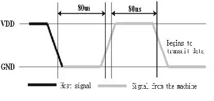 DHT11 the DATA pin when external signals detected low, waiting for the external signal low end, after a delay DHT11 the DATA pin is an output, the output low as 80 microseconds response signal, followed by the output of 80 micro-notify the second high peripheral is ready to receive data, the microprocessor I / O at this time in the input state detecting I / O with low (DHT11 echo signal) to the wait for 80 microseconds high data receiving and sending signals as shown: