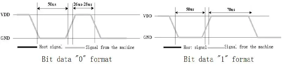 The 40 bit data output by the DHT11 DATA pin, the microprocessor according to the change of I/O level receive 40 bits of data, a data format of “0”: high level and low level of 50 microseconds and 26-28 microsecond, format data “1”: low level 50 microsecond plus 70 microsecond high. Bit data “0”, “1” format signal as shown in fig: