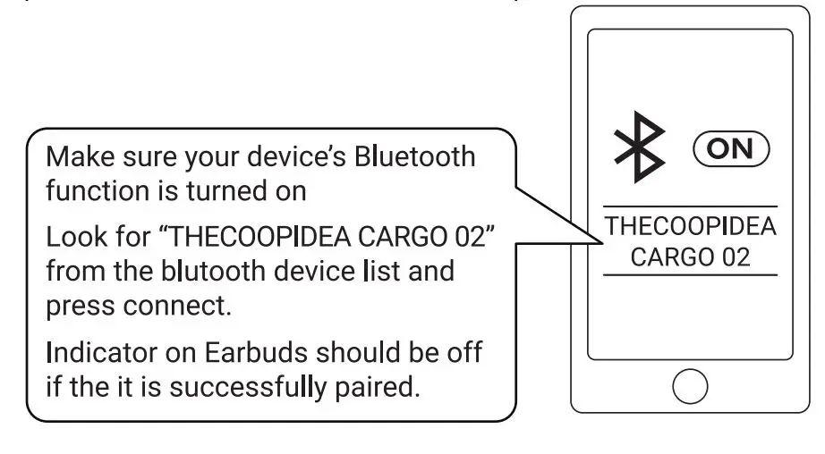Always store the earbuds in the charging case and safely protected. Avoid storing the earbuds in hot or cold environments to prevent depletion of the battery capacity Avoid storing the earbuds for extended periods of time without recharging them. If the earbuds or the charging case become dirty, it is recommended to clean them witha Soft cloth that has been dampened with clean water. The OS version of mobile devices may affect performance of CARGO 02, it is recommend- ed to update the 0S of your mobile device to the latest version before use. Don’t put the CARGO 02 into Charging case while there is moist. Doing so can cause severe damage to the electronics or housing of CARGO 02. CARGO 02 Charging case is not waterproot. Store the product in a dry area. Keep away from fire, heat, moist and erosive materials. Remove from power source once the product is fully charged. Extended periods of over-charging will decrease battery life. It is strongly recommended to clean and dry CARGO 02 properly when it has been exposed to water and sweat. Do not use rough chemical such as soap or cleanser to scrub the product. Do not dissemble, damage, or expose the product to water or fire. Warranty will be voided by any misuse of the product. If the battery is expanded or emits smell, stop using the product immediately.