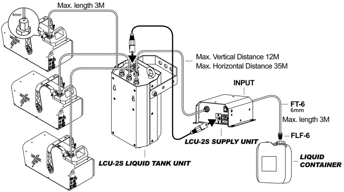 – The max vertical distance between the LCU-2S supply unit (pump) and LCU-2S liquid tank unit can be up to 12 meters while the max horizontal distance can reach 35 meters
